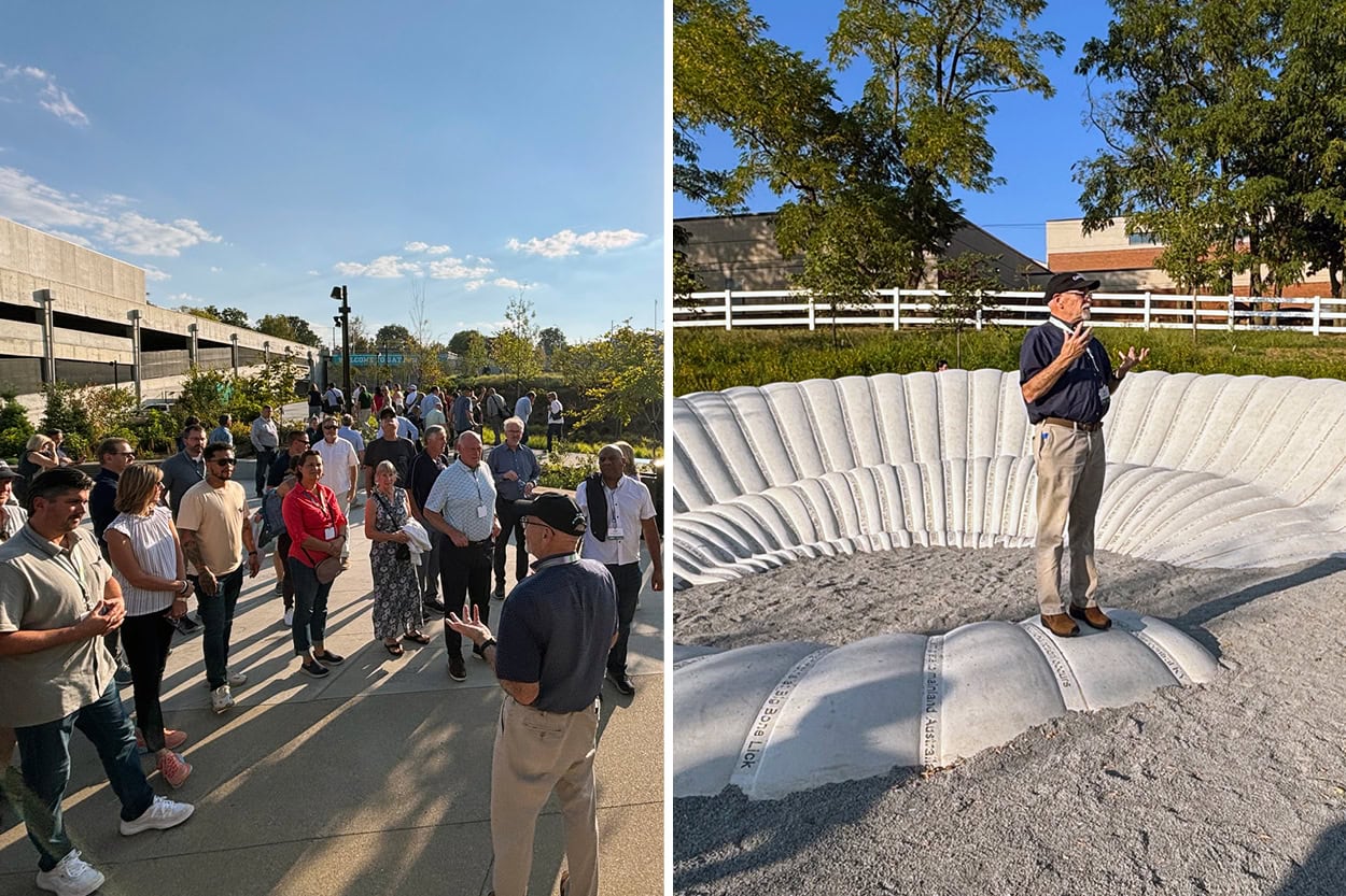Former CLARB president John Carman led attendees on a walking tour of Lexington's newest public space, Gatton Park on the Town Branch. They learned about the park’s innovative approach to climate resilience, hydrology and inclusive community design.